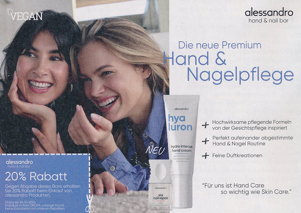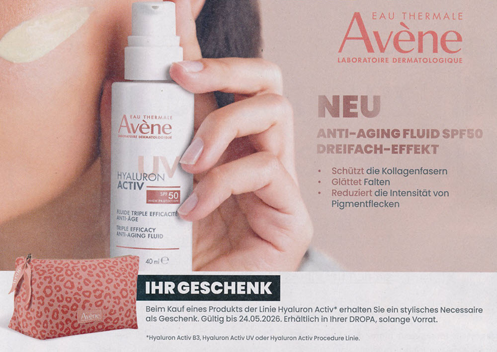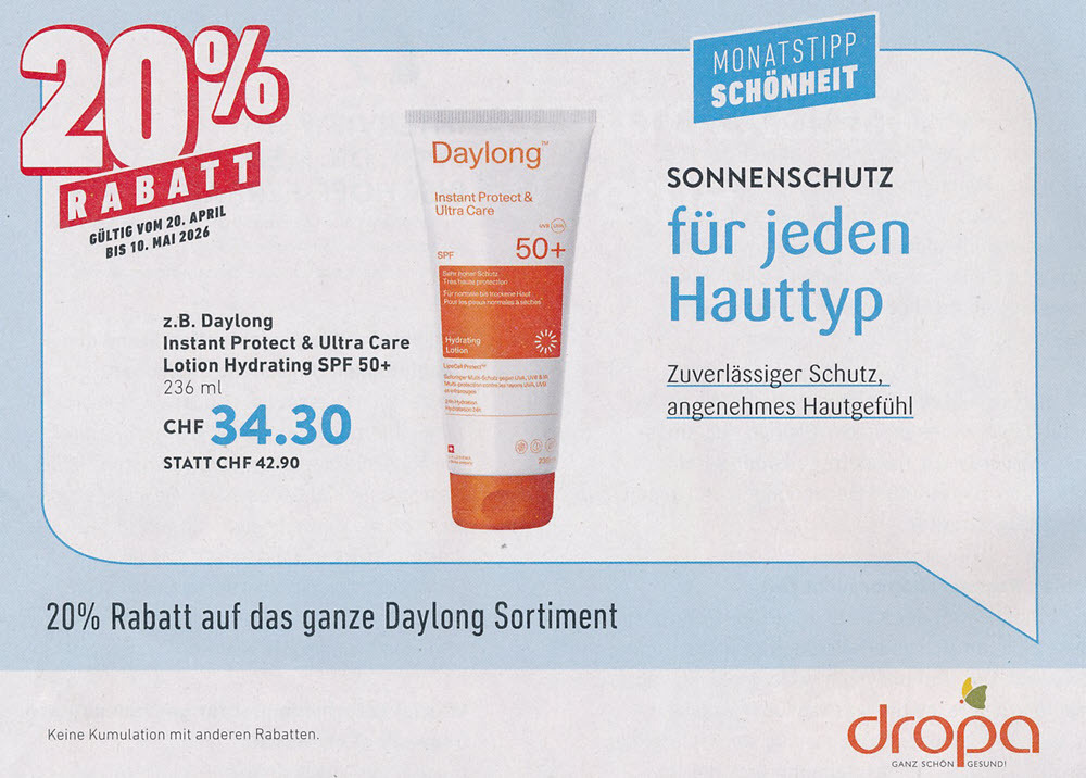 10 % Rabatt bis DONNERSTAG 30. APRIL 2026 mit dem Gutschein aus der DROPA BALANCE ZEITUNG. Beachten Sie die Gutscheine und die vielen Angebote in der DROPA BALANCE ZEITUNG!
