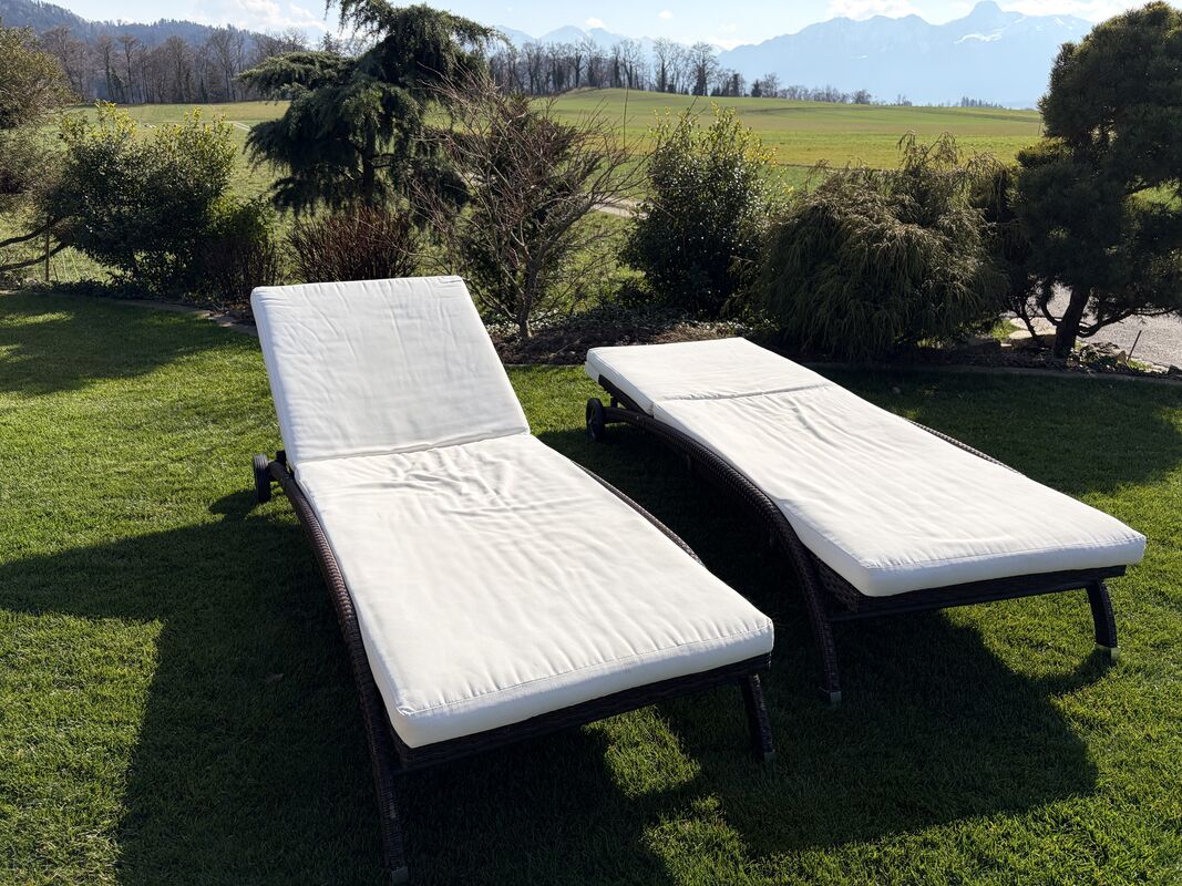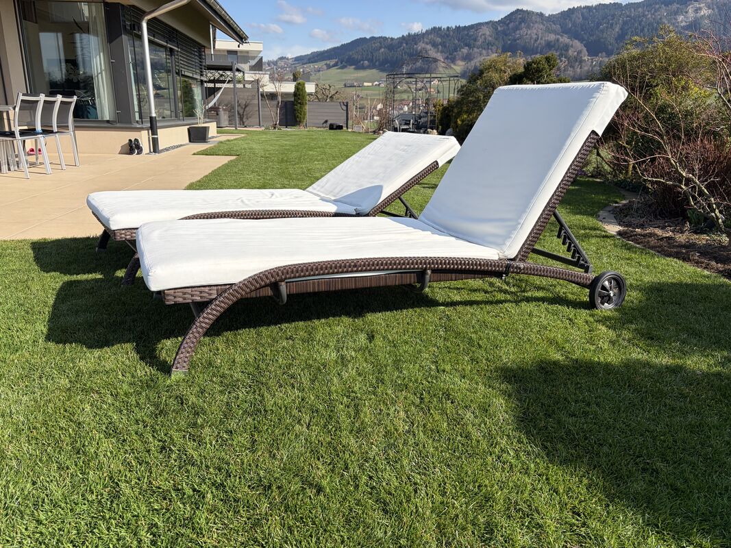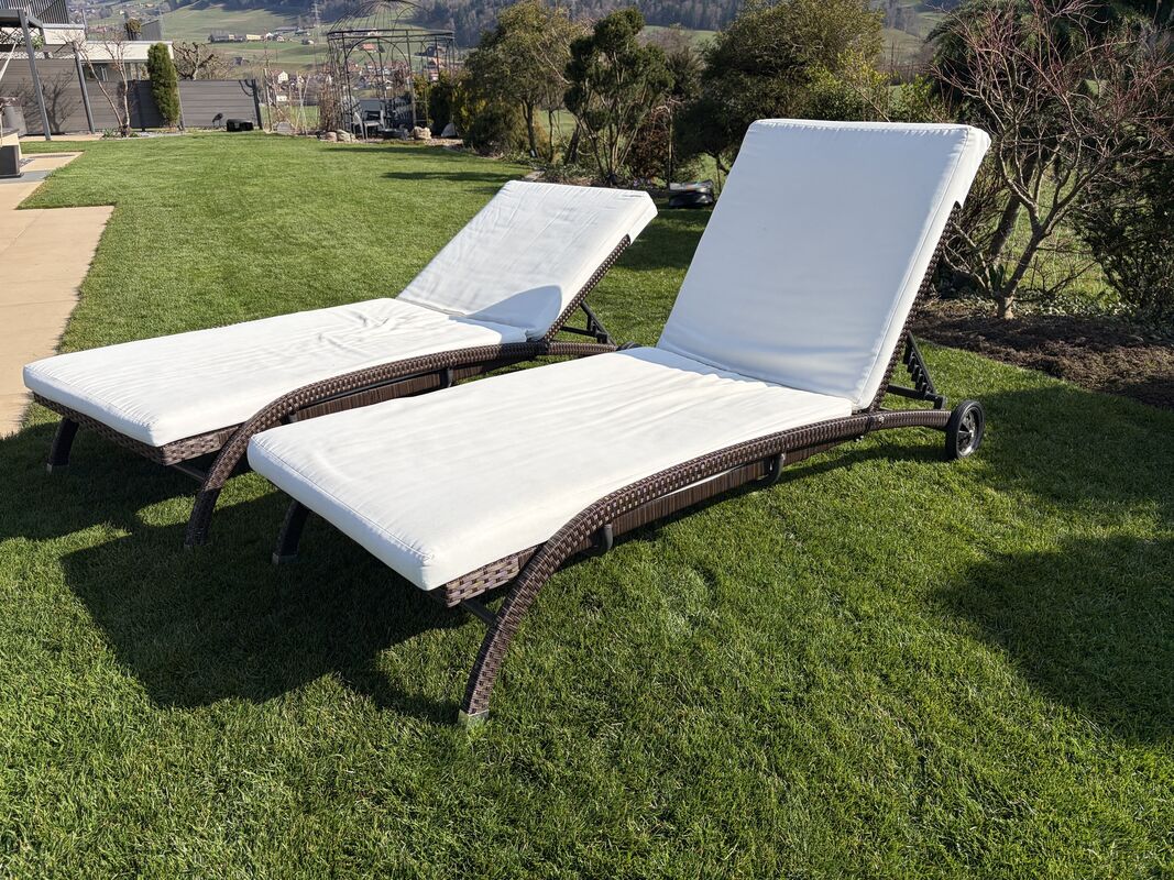 2 Liegestühle Rattan dunkelbraun mit Rädern