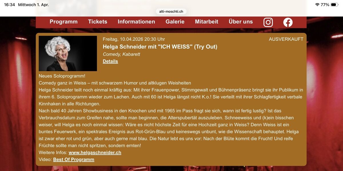 2 Tickets - Helga Schneider mit "ICH WEISS" - Freitag, 10. April 2026, Alti Mosti in Mühleturnen
