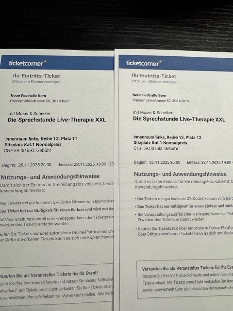 Verkaufe 2 Tickets für Die Sprechstunde Live-Therapie XXL in der neuen Festhalle Bern mit Moser und Schelker.