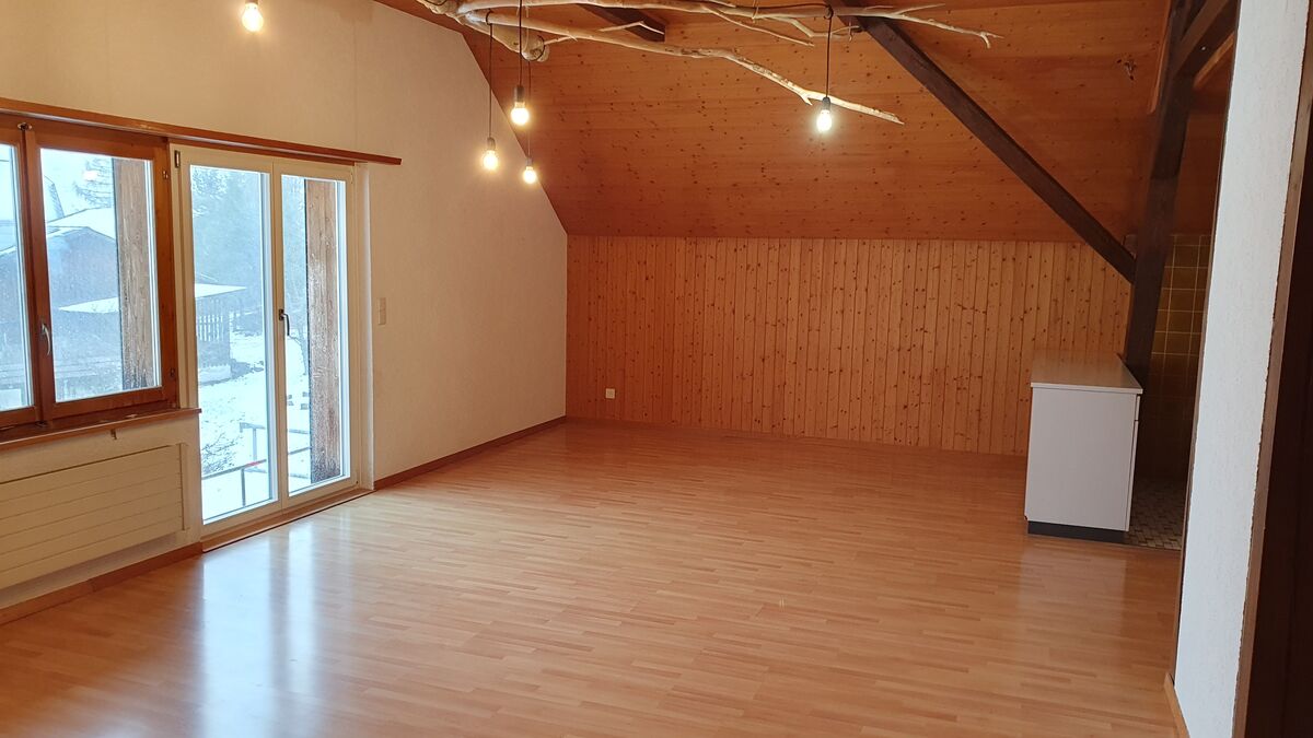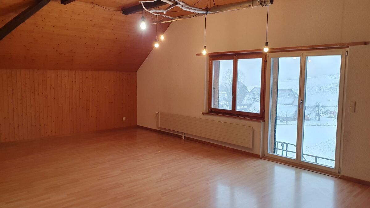 Äusserst grosszügige (56 m2) 2-Zimmer-Dachwohnung auf dem Land zu vermieten. In einem Stöckli gelegen mit grossem Balkon und Aussicht auf die Berge. Autoparkplatz inklusive. In den Nebenkosten sind die Heizungskosten, Kehrricht- und Abwassergebühr enthalten. Wer die Ruhe sucht, wird hier fündig!