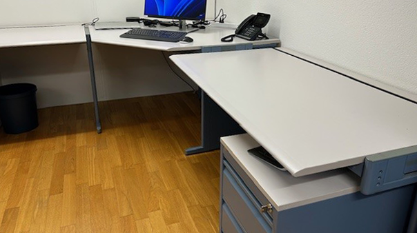 Massive, gebrauchte Schreibtischkombination, guter Zustand mit Gebrauchsspuren, Tischblatt in weiss, Tischbeine in grau/blau, Büromöbel von Büro Keller, die Scheibtische verfügen über einen Kabelkanal und sind höhenverstellbar (ohne Schubladenstock).