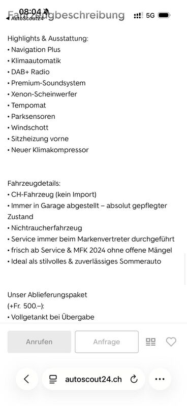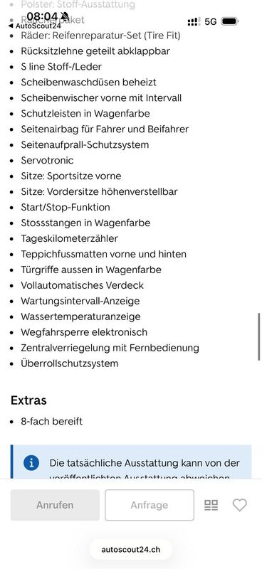 Ich verkaufe mein geliebtes Cabriolet (CH-Fahrzeug), das immer in der Garage abgestellt wurde. Es ist in einem absolut gepflegten Zustand, jährlich im Service, ist ein Nichtraucherfahrzeug, wurde im Winter nicht gefahren und hat eine MFK bis 2024. Es ist unfallfrei, verfügt über allerlei Luxus wie DAB-Radio, Parksensoren usw. und ist mit 8-fach Bereifung (Sommer Alufelgen/Winter Stahlfelgen) ausgestattet. Erste Inverkehrsetzung 03.05.2014.