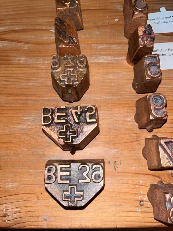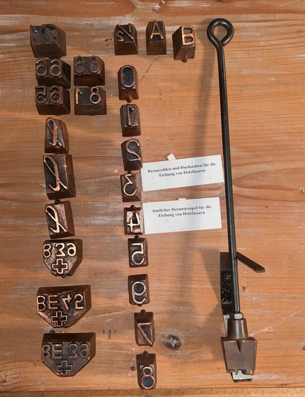 besteht aus Brennzahlen und Buchstaben, gedacht für die Eichung von Holzfässern. Ein amtlicher Brennstempel, historisch, einmalig aus dem Kanton Bern.