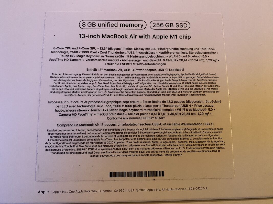 MacBook Air 13" (Late 2020), Apple M1 (8x 3.2GHz/7-Core GPU), 8.0GB RAM, 256GB SSD