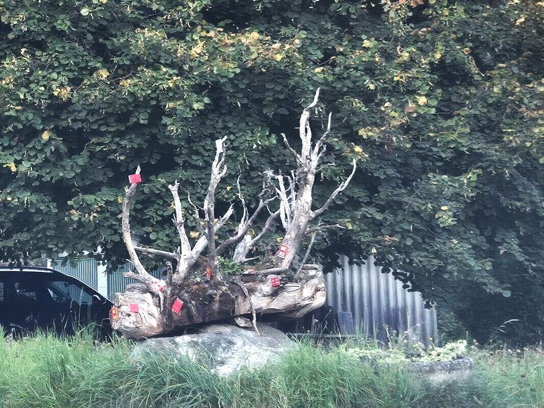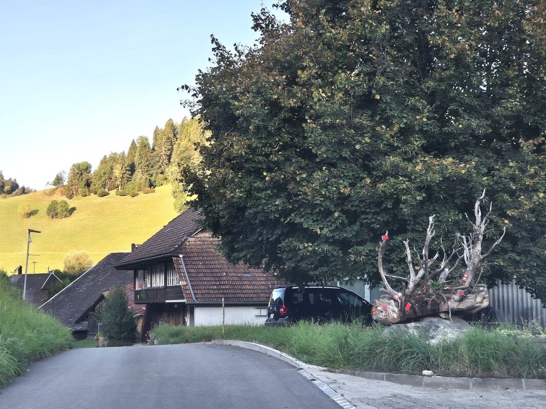 Es war eines der schwierigeren Wo-ist-das-Suchbilder. Nur sehr wenige Einsendungen gingen ein, das Postfach lief nicht über. Eine einzige Person wusste, dass sich dieser Baumstrunk, verziert mit alten Velonummern, an der Schwendistrasse in Bigenthal befindet.