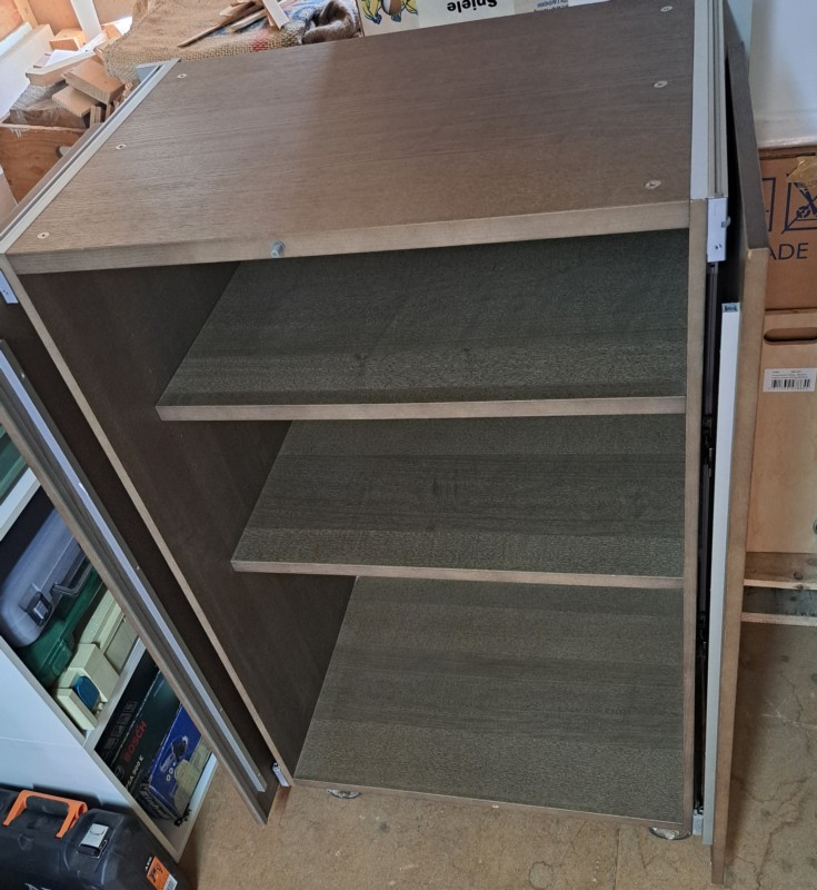 Mit einem fixen und einem verstellbaren Tablar und Einschubtüren.