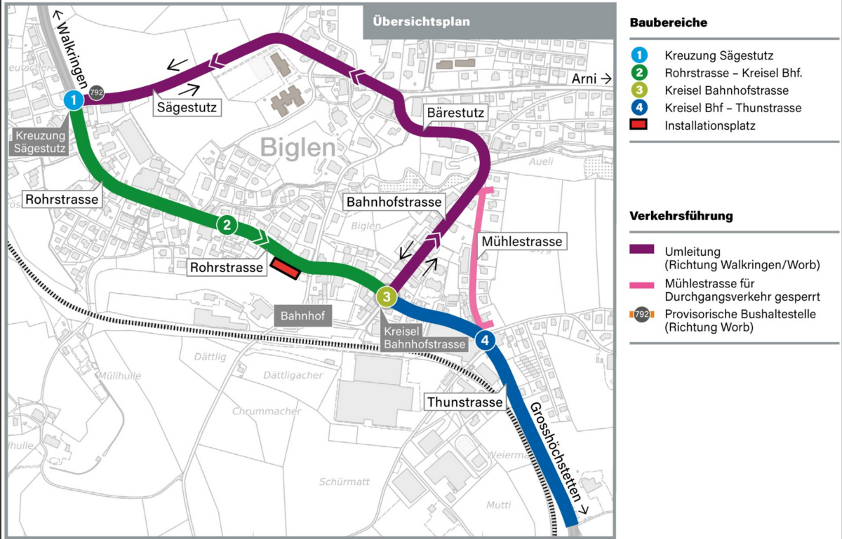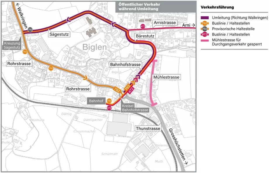 Zur Bauerei: Eine Umleitung Richtung Walkringen/Worb ist signalisiert. Von Grosshöchstetten herkommend wird der Verkehr ab dem Kreisel Bahnhofstrasse über den Bärenstutz und den Sägestutz umgeleitet. Diese Umleitungsstrecke bleibt in beiden Richtungen befahrbar. Der Verkehr in Richtung Grosshöchstetten wird auf der Rohrstrasse im Einbahnsystem durch die Baustelle geführt.