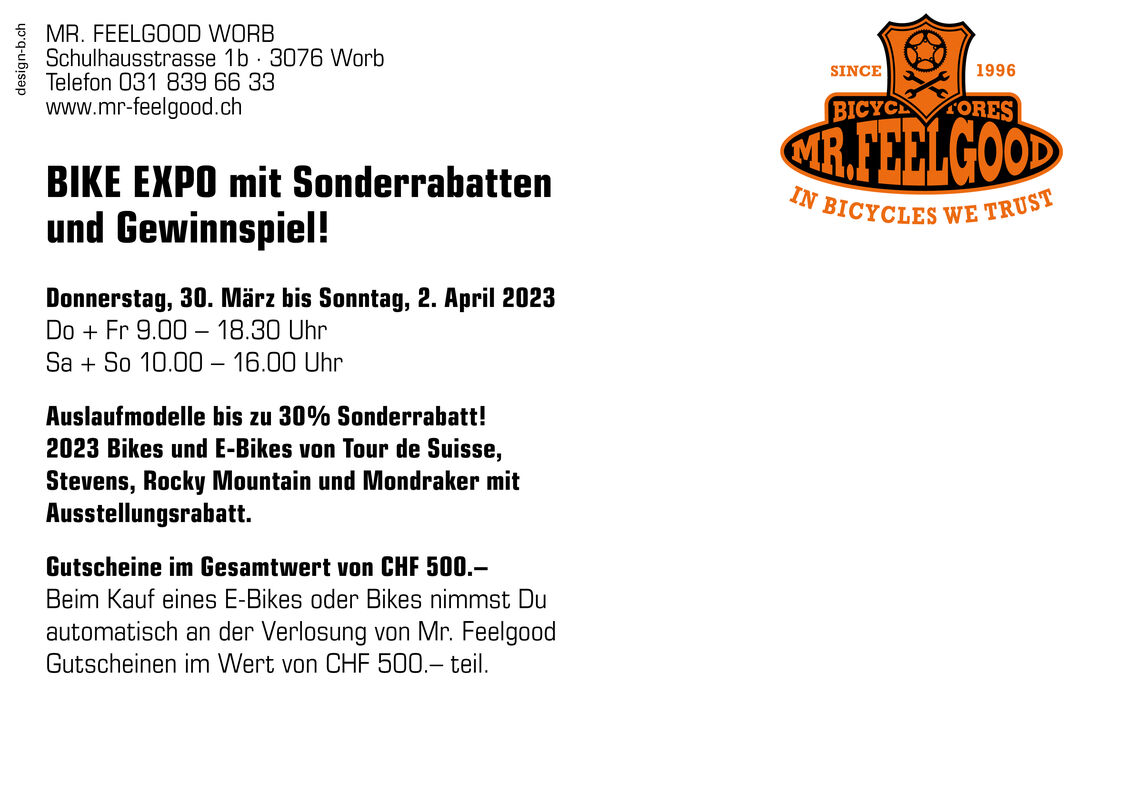 An der Bike Expo Woche gibts Auslaufmodell mit bis zu 30% Sonderrabatt! Bikes und E-Bikes von Tour de Suisse, Stevens, Rocky Mountain und Mondraker um Testen und mit speziellem Expo Rabatt.
