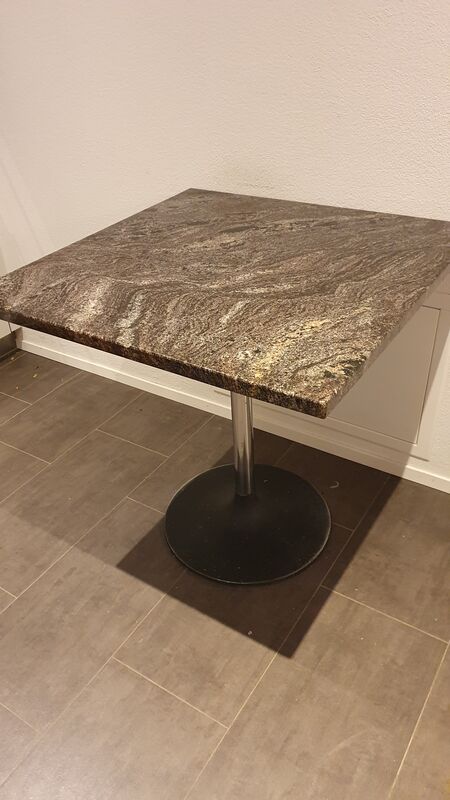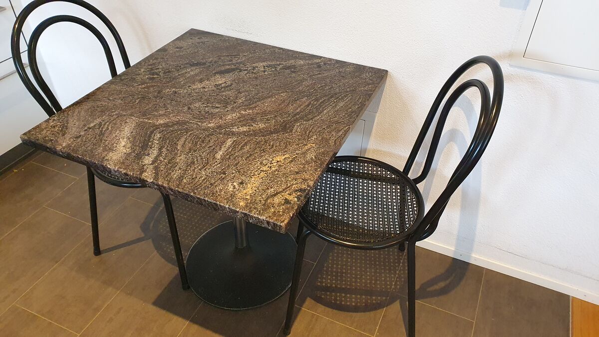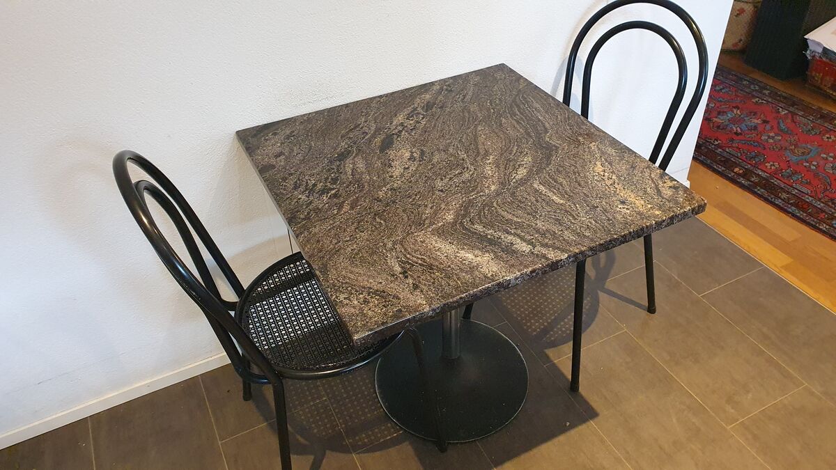 Sehr schöner Bistro Küchentisch, oder für den Balkon. 70 x 70 cm. Granitplatte, 2 Stühle metall schwarz, ein dritter Stuhl ist gratis.
