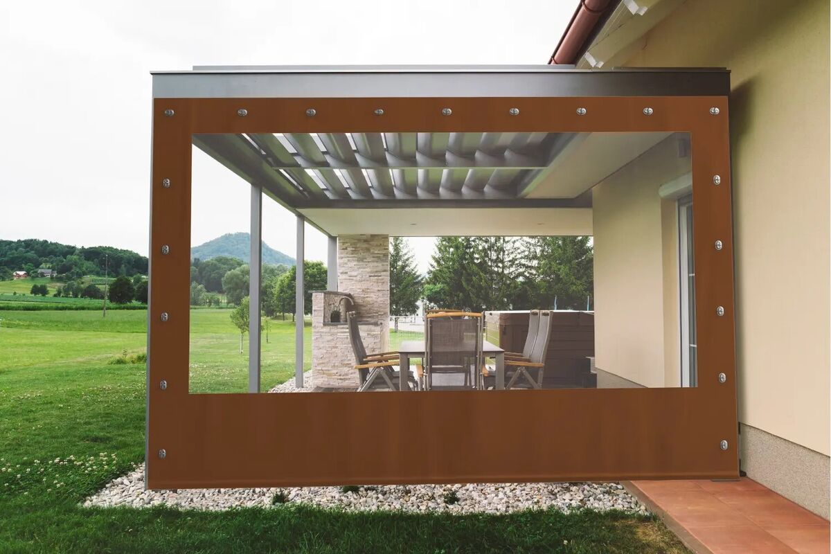 Terrassen oder Carportblache.Farbe Braun. Abmessungen Breite 252mm Höhe 230mm Oben und auf der Seite hat es Ösen zum befestigen. Die Blache ist neu und ungebraucht.
