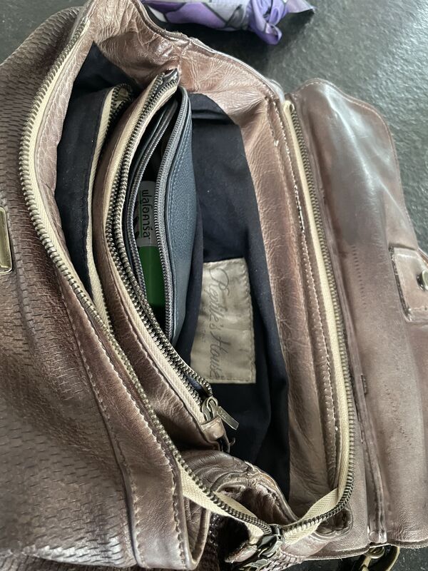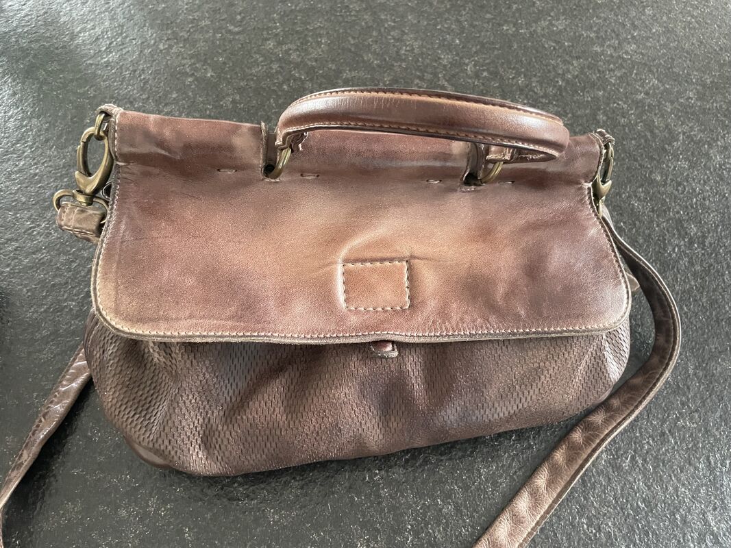 Lederne Handtasche mit Handgriff und mit Schulterriemen. Zahlreiche Innenfächer mit und ohne Reissverschluss.