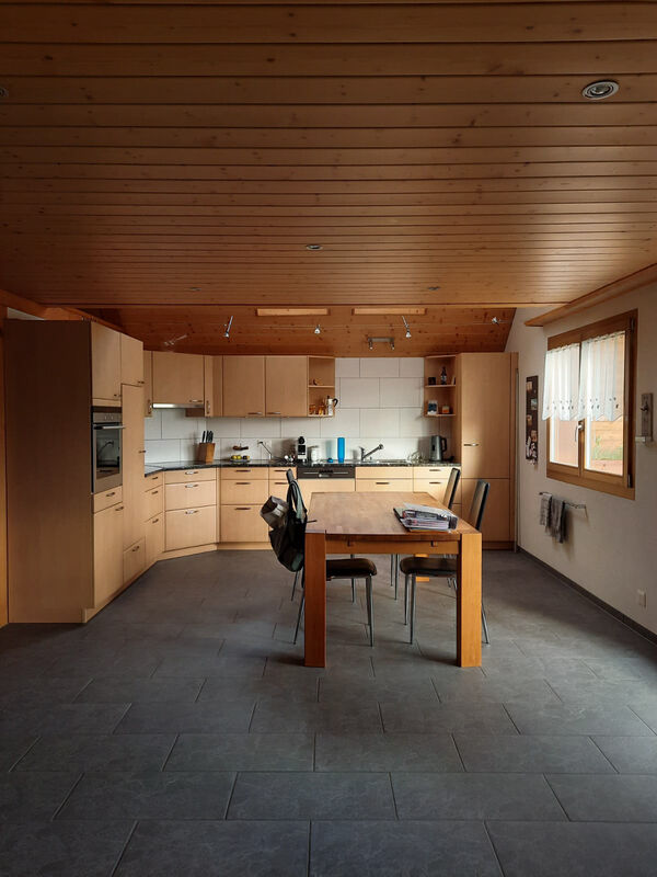 Die Küche ist gross, geräumig und sehr hell dank grosser Fenster.