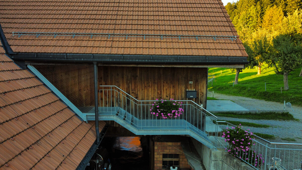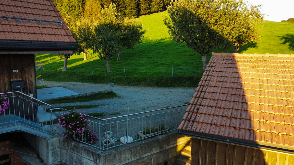 Auf dem unteren Stockwerk ist ein grosser Balkon mit Mittagsonne und einer guten Fehrnsicht.