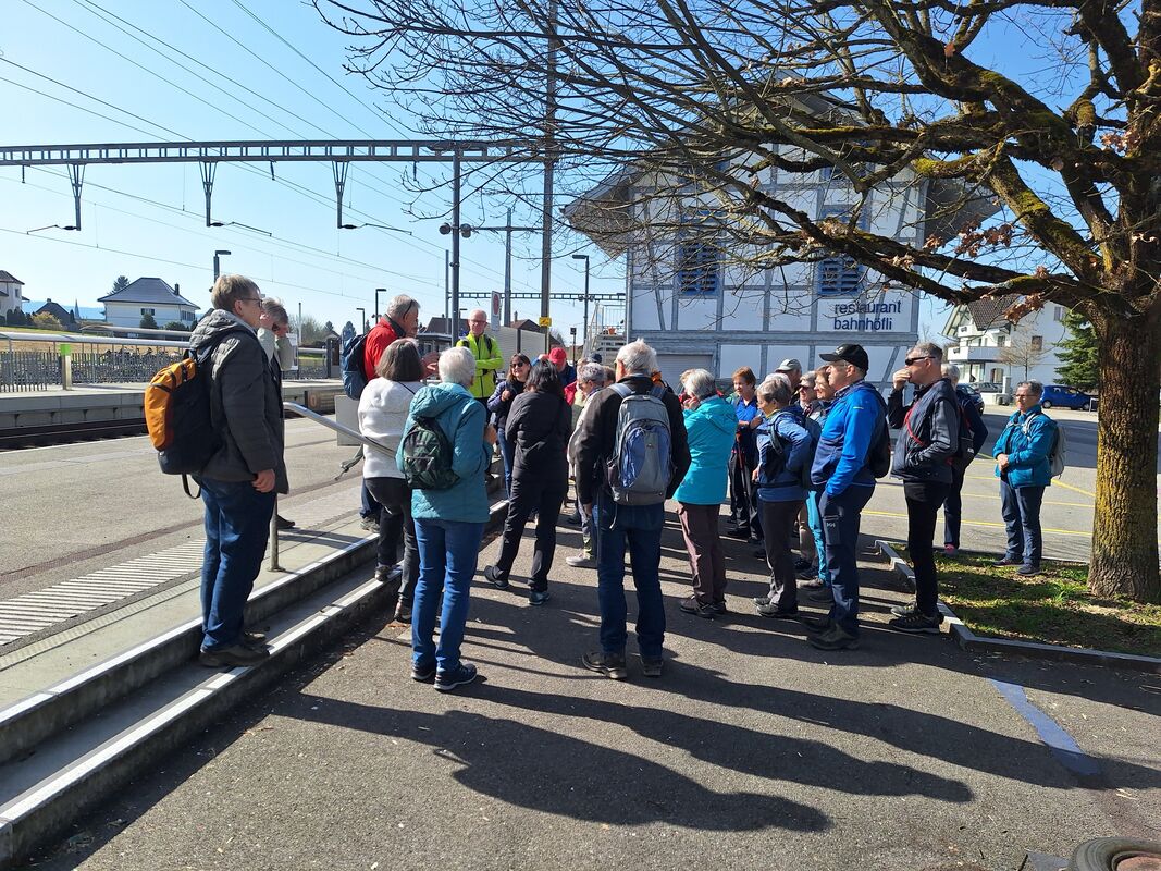 Nach der interessanten Besichtigung setzte die Wandergruppe ihren Weg Richtung Bahnunterführung fort. Von hier aus und für den Rest der Wanderung hatte man einen fantastischen Blick über die weite Landschaft und den Jura in der Ferne.