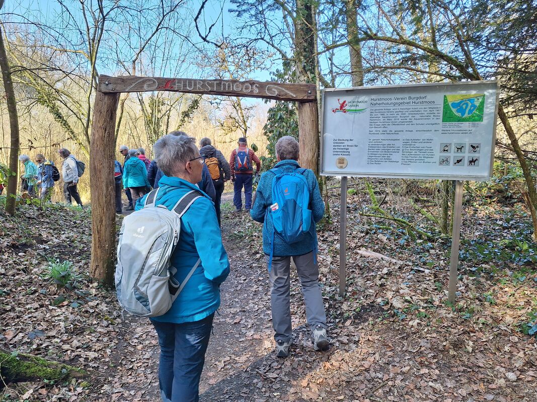 Mit der Bahn erreichte die grosse Wandergruppe das Dorf Hindelbank. Nach einer kurzen Orientierung durch den Wanderleiter Fritz Schafroth wanderte die Gruppe Richtung «Hurstmoos».