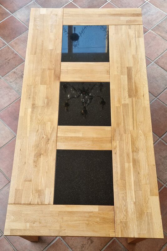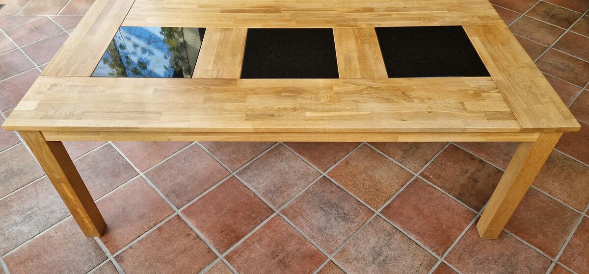 Toller Esstisch, Eiche-Massivholz, geölt, ausziehbar, mit hitzebeständigen, schwarzen Granitplatten-Einsätzen für nur Fr. 750.--