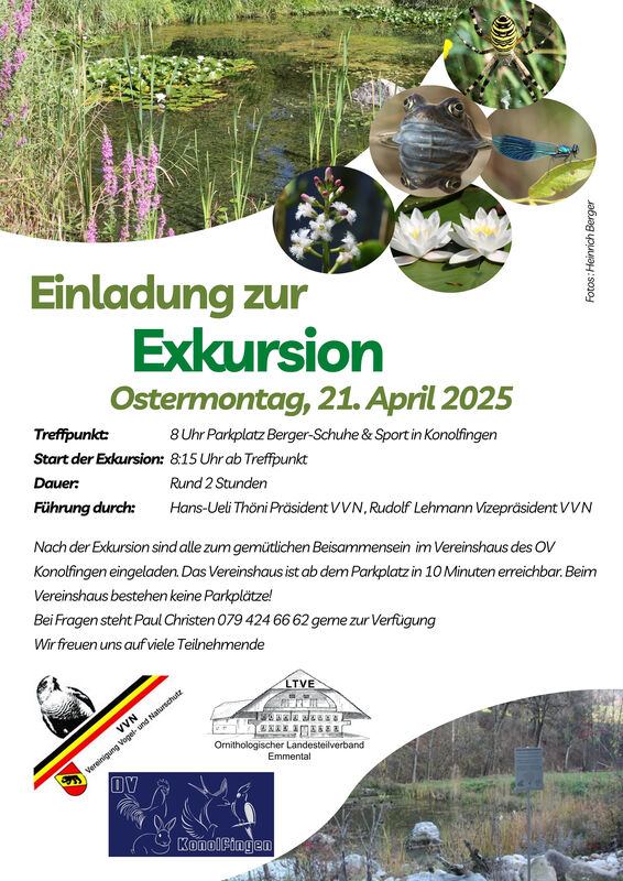 Die beiden ausgewiesenen Ornithologen Hans-Ueli Thöni Präsident des Vereinigung Vogel- und Naturschutz (VVN) und Rudolf Lehmann Vizepräsident VNN führen zu den Biotopen bei der ARA Konolfingen und ins Holz. Die Erbauer/Betreuer Heinrich Berger und Christian Bay sind auch vor Ort.
