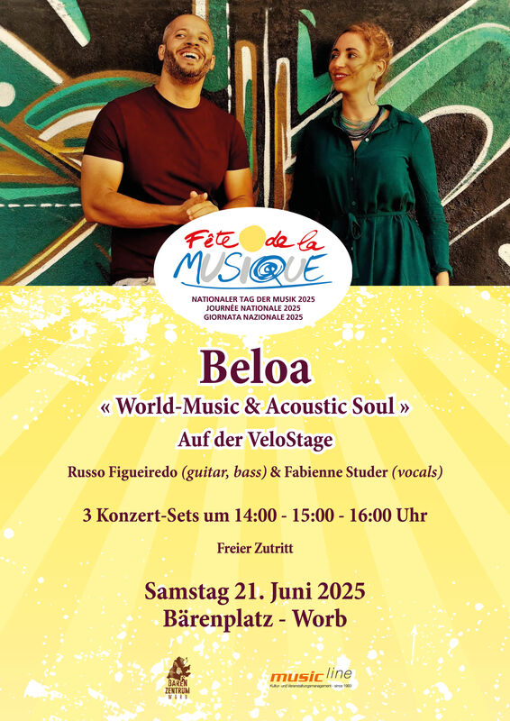 Zur diesjährigen «Fête de la Musique» spielen Russo Figueiredo (Gitarre, Bass) & Fabienne Studer (Gesang) als BELOA ihre feinen World-Music & Acoustic-Soul-Songs auf der VeloStage.
