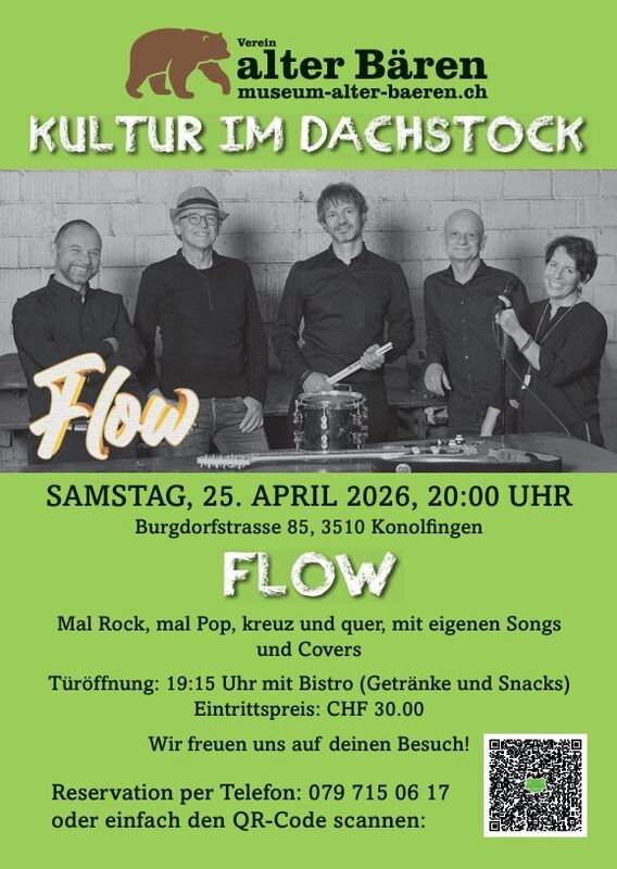 25.04.2026 Türöffnung um 19:15 Uhr mit Bistro, Konzert um 20:00 Uhr Reservation unter: 079 715 06 17