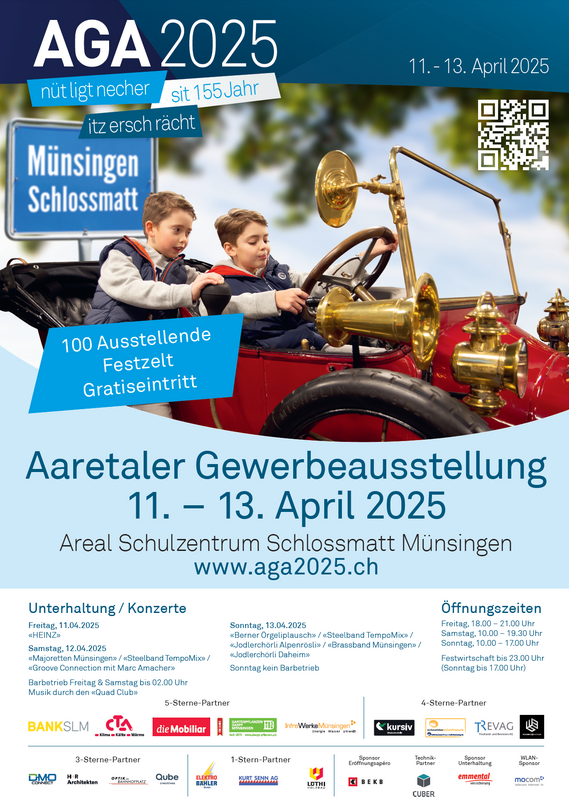 Die Hauptattraktion der Aaretaler Gewerbetreibenden steht wieder vor der Tür. Alle fünf Jahre findet die Aaretaler Gewerbeausstellung AGA statt. Vom 11. bis 13. April 2025 ist es soweit. Die Schulanlage Schlossmatt in Münsingen wird unter dem Motto «Nüt ligt necher – sit 155 Jahr – itz ersch rächt» zum riesigen Schaufenster des Aaretaler Gewerbes. 2020 und 2021 musste die AGA aus bekannten Gründen zuerst verschoben und danach ganz abgesagt werden. Nun sind die Firmen aber wieder bereit und voll motiviert der Bevölkerung zu zeigen dass sie noch da sind und immer noch stark vertreten sind.
