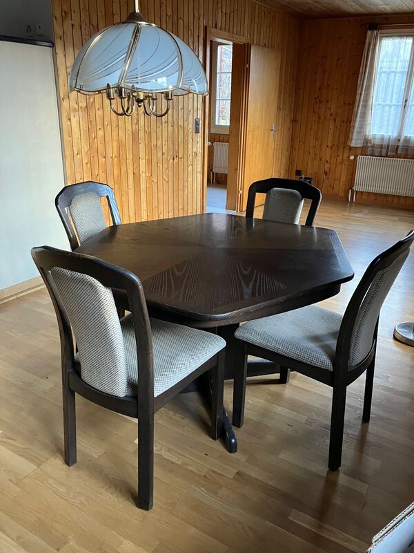 6-eckiger Tisch, ausziehbar, mit zwei Einlegeplatten. Dazu gehören 6 Stühle (gepolstert).
