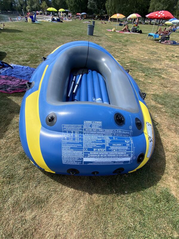 Gummiboot mit Padeln und Kissen und Pumpe.