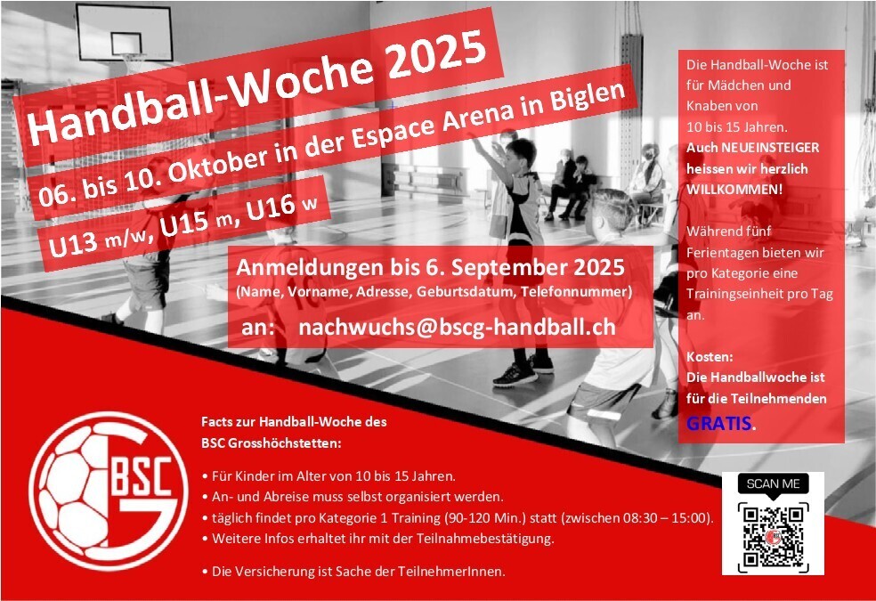 Vom 06. bis 10. Oktober 2025 führen wir (BSC Grosshöchstetten/BSCG Handball Biglen) eine Handball-Woche in der Espace Arena in Biglen durch. Angesprochen sind Mädchen und Knaben von 10 bis 16 Jahren. Auch Neueinsteiger heissen wir herzlich willkommen.