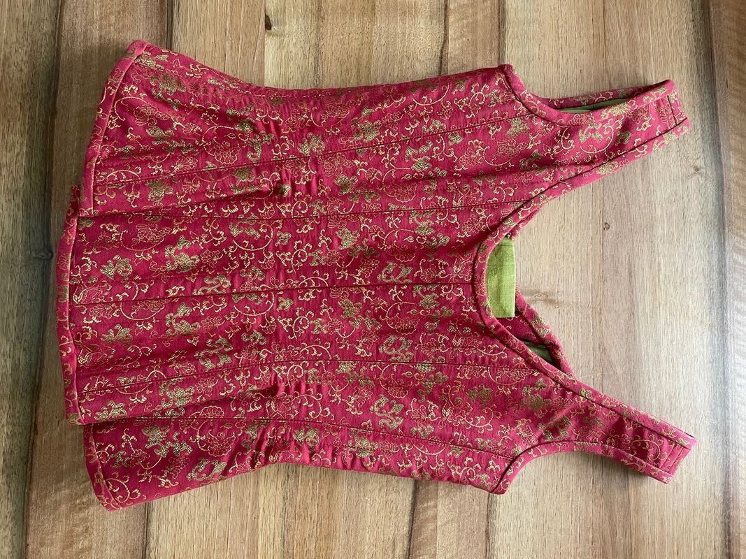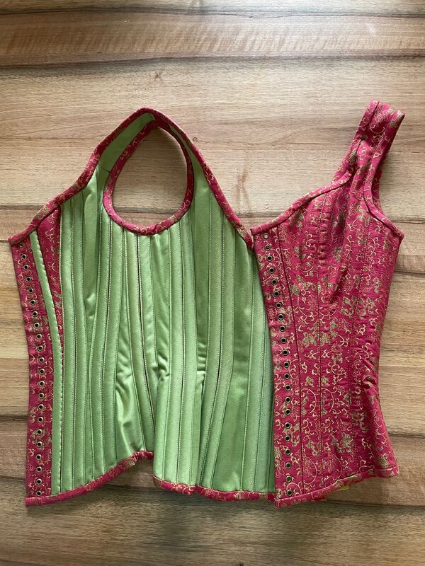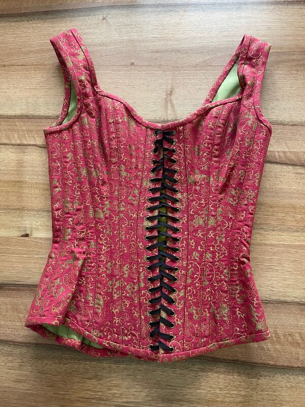 Wunderschöne Corsage - hergestellt von Beata Sievi. Corsage aus Baumwolle, Innenfutter grün. Schnürung grün oder schwarz. Hose aus Rohseide grün.
