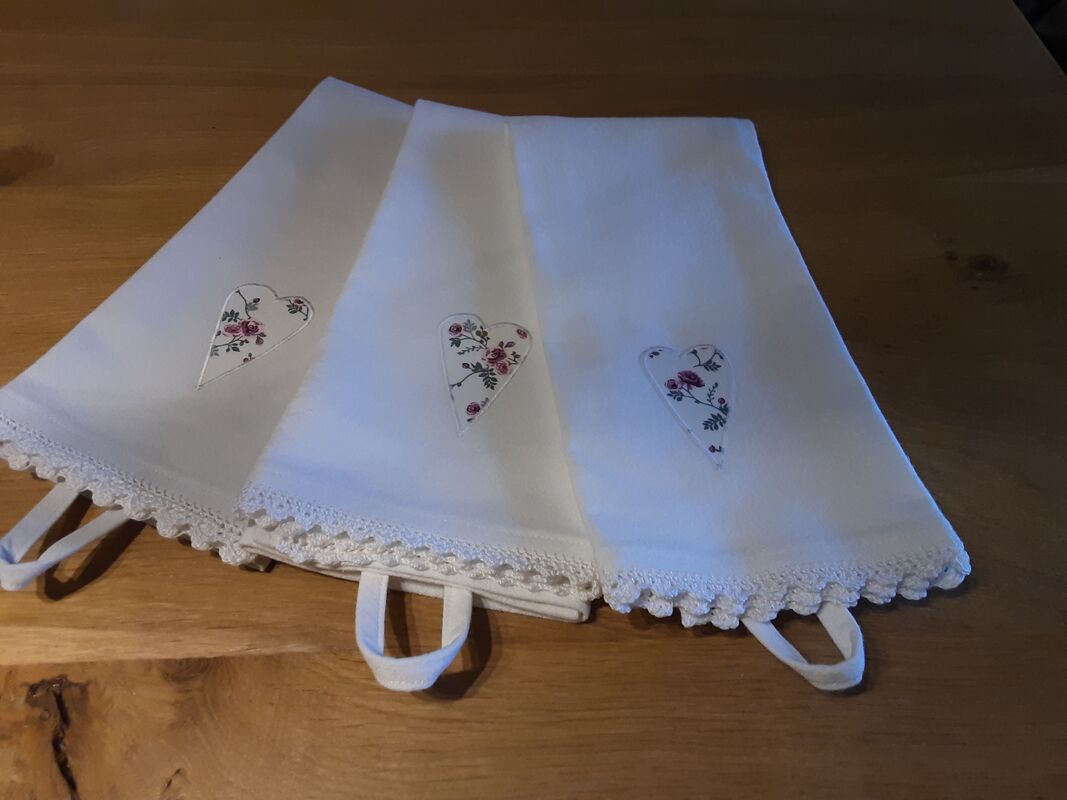 Eine hübsche Geschenkidee zu Oster, Handtücher genäht aus wunderschönen alten Bauernstoffen mit Herzapplikation und handgehäkelter Spitze Fr 14, erhältlich im Arnibröckli am Brunnenweg 1 3508 Arni. Jeden Donnerstag und Freitag von 14bis18 Uhr und jeden 1.und2 Samstag im Monat von 10bis16 Uhr geöffnet.