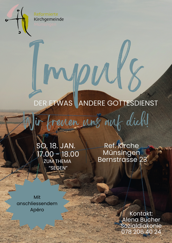 Der nächste ImPuls-Gottesdienst findet statt am Sonntag, 18. Januar, 17.00 Uhr, in der Ref. Kirche Münsingen zum Thema Segen mit anschliessendem Apéro in der Kirche statt.