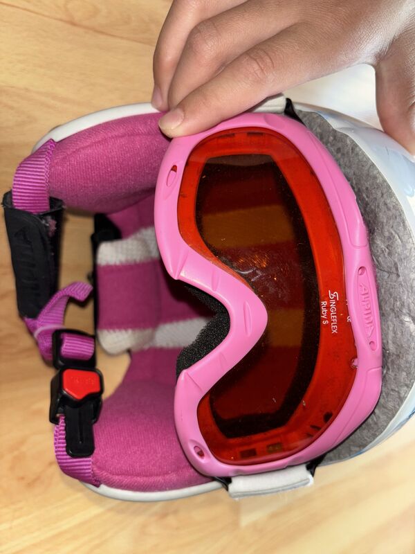 zu verkaufen: Kinderskihelm von Alpina. Unfallfrei. Grösse 48-52. Mit rosa Skibrille. Preis CHF 20.