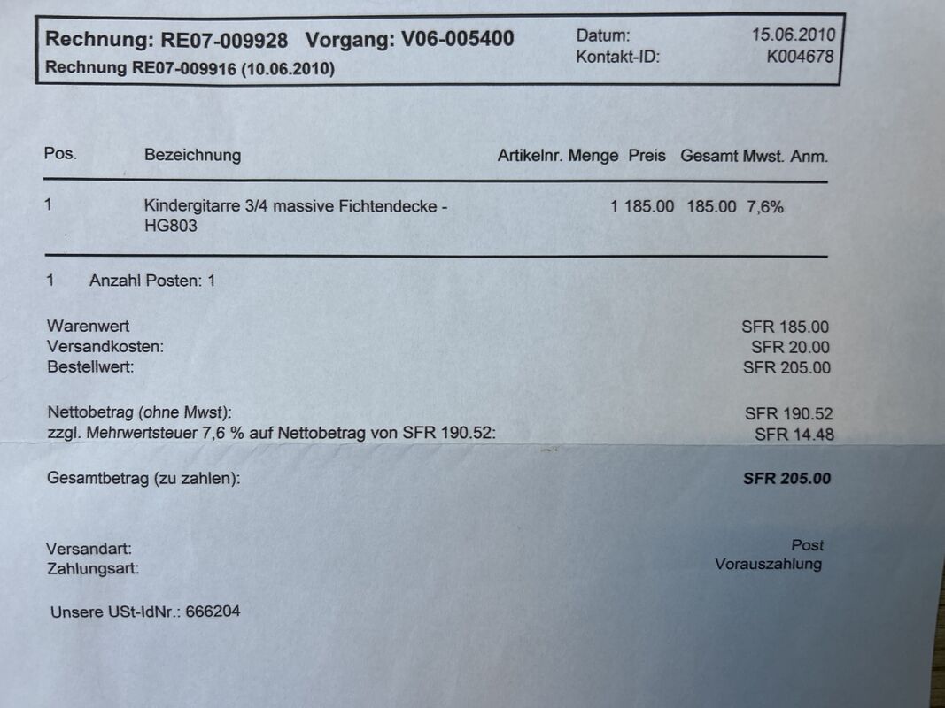 Kindergitarre 3/4 massiv Fichte.