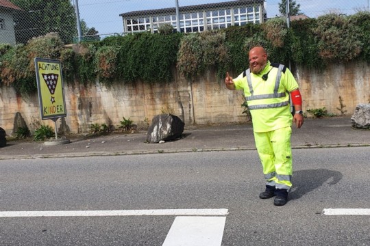 "Die meisten Leute geben mir ein Lachen zurück", erzählt Zbinden. Ob er den Verkehr auch so fröhlich durchgewinkt habe, als es regnete? "Klar, fürs Wetter kann ich ja nichts." Wieder strahlt er, macht das Victory-Zeichen, nickt und winkt Autos durch. Auch wenn er einkaufen gehe, versuche er jeweils so freundlich wie möglich aufzutreten. Ich glaube es ihm. Es gibt auch Autofahrer:innen, die ihn mürrisch anschauen, solche die nicht winken. "Jeder hat seinen Rucksack, die können nichts dafür."