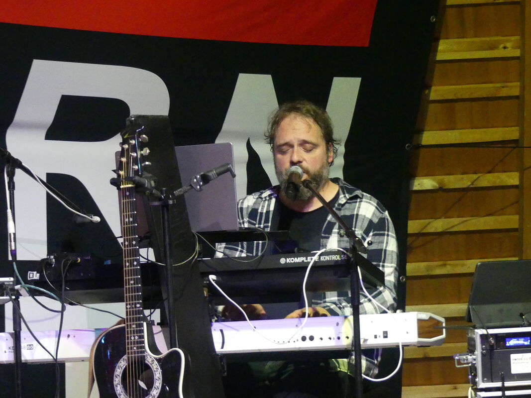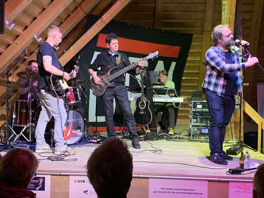 Nach der Pause überraschte Mike Bader mit seinem Keyboardsolo und der Geschichte um den Flaschengeist "Dschini", der wieder zurück in die Flasche und auch dableiben soll. Bader wechselte 2020 nach dem Abgang des Gründungsmitglieds und Sänger, Lele Seiler, vom Keyboard zum Lead-Gesang. Gerade auch die Mundarttexte – gewürzt mit einer Prise Schalk, Pointen, treffsicher mit einem Augenzwinkern – sind das Salz in der Suppe.