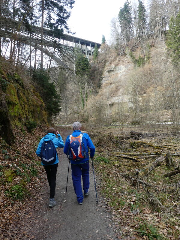 Mit der Bahn erreichten die Wandergruppe die Station Schwarzwasserbrücke. Unsere Leiterin Eliane Gassmann informierte kurz über die bevorstehende Wanderung bevors Richtung Schwarzwasser runter ging. Nach kurzer Wanderung dem Schwarzwasser entlang stand die Wanderschar unter den beiden Brücken über die Sense. Die 170 Meter lange Strassenbrücke – ein technisches Wunderwerk aus Stahl – von 1882 und die Eisenbahnbrücke aus dem Jahr 1979 sind auch von unten gesehen beeindruckend.