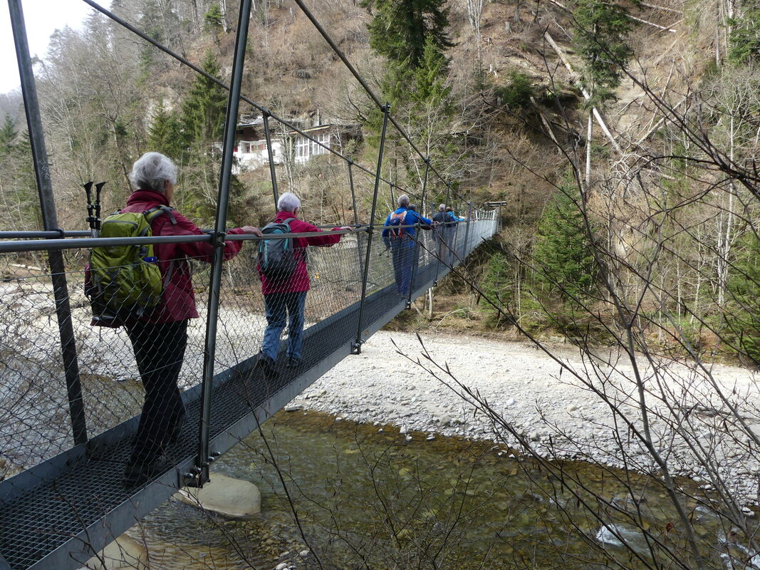 Weiter gings vorbei am anderen Ufer liegenden Heitibüffel, der Büffelfels ist auch bekannt als Kletterwand. Über den direkt am Felsen angebrachten Holzsteg, vorbei an der Hundsflue und der Sensenau erreichten die Teilnehmenden die Riedernbrücke. Über die 1951 erstellte Holzbrücke erreichten sie das andere Senseufer. Das Wanderziel – Thörishaus – war in Sicht. Der östliche – grössere – Teil des Dorfes gehört zur Gemeinde Köniz. Der westliche Teil gehört zur Gemeinde Neuenegg. Vor der Heimreise konnten alle im Sternen ihren Durst stillen.