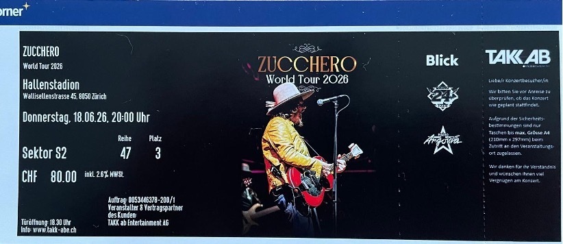 Sitzplatz-Ticket für das Zucchero Konzert vom 18.06.2026 im Hallenstadion Zürich.
