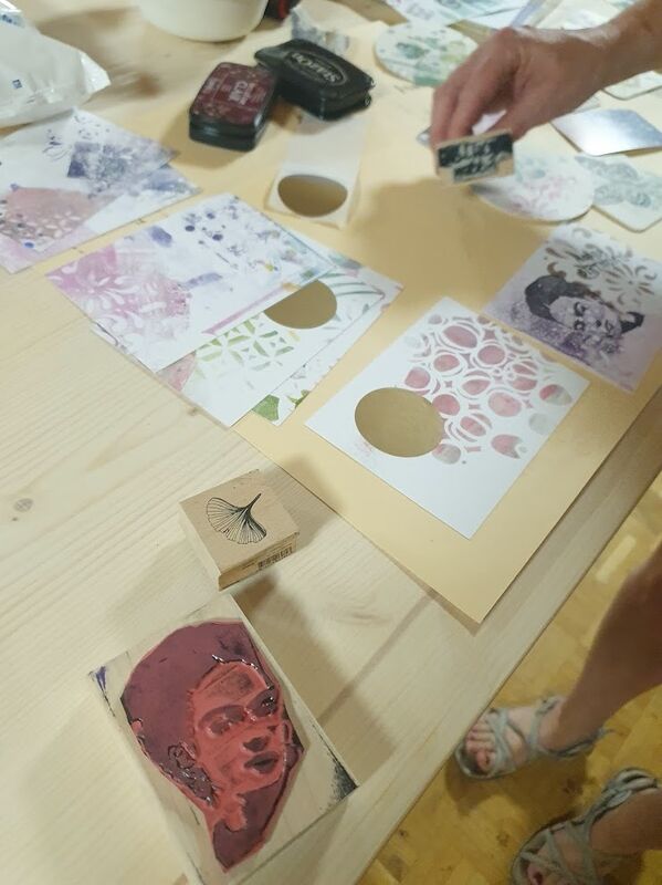 Im Februar: Gelliprint, mit Trockenblumen und Lichtobjekte