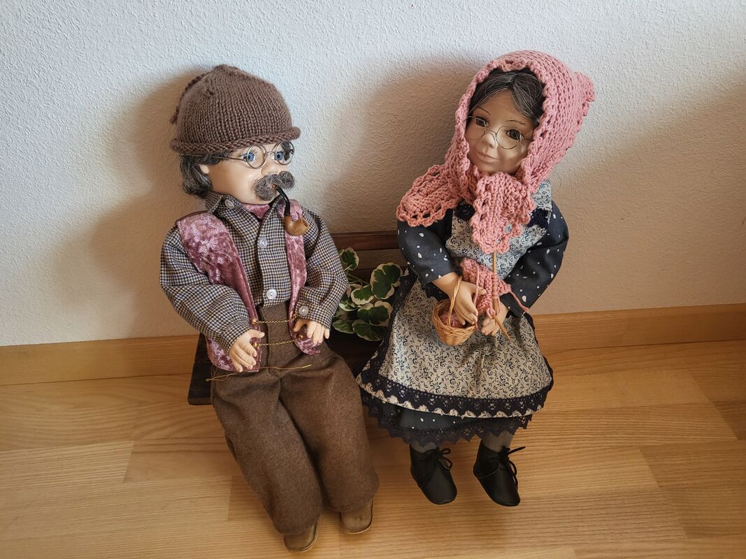 Die zwei Puppen Grossmüetterli und Grossvätterli freuen sich auf ein neues Plätzchen.
