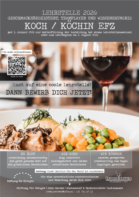 Bist du geschmackbegeistert, ein Teamplayer und wissenshungrig? Dann bewirb dich jetzt bei uns für die Lehrstelle per 1. Januar 2026 zur Weiterführung der Ausbildung bei einem Lehrstellenwechsel oder zum Lehrbeginn am 1. August 2026 als Koch/Köchin EFZ.