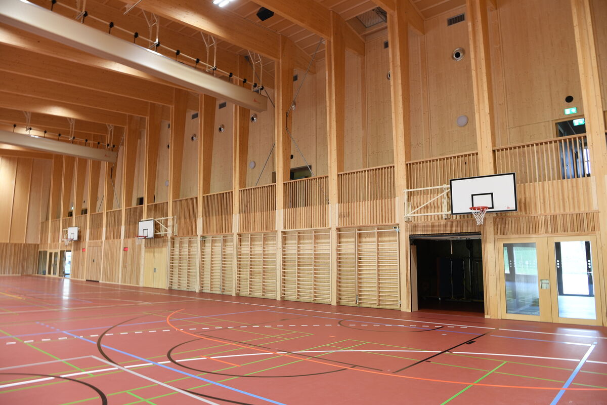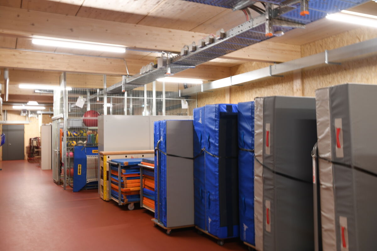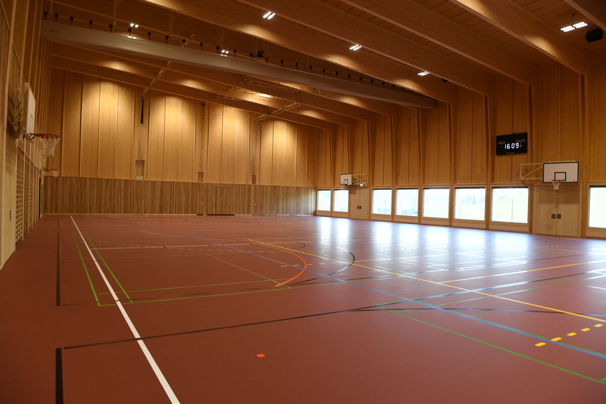 Ein erster Blick in die grosse Halle lässt das jedoch nicht vermuten: Der Boden leuchtet in einem dunklen Rot, durchzogen von zahlreichen Spielfeldlinien, die Wände sind mit verschiedenen Holzarten verkleidet. «Die Halle kann durch zwei Faltwände in drei einzelne Hallen unterteilt werden», erklärt Schweizer. Die Hallen 1 und 2 sind für verschiedene Ballsportarten ausgelegt, Halle 3 ist mit Reck, Ringen und Klettertau für das Geräteturnen ausgestattet. «Jede Halle – und jede mögliche Konstellation – ist mit Linien für diverse Sportarten versehen.»