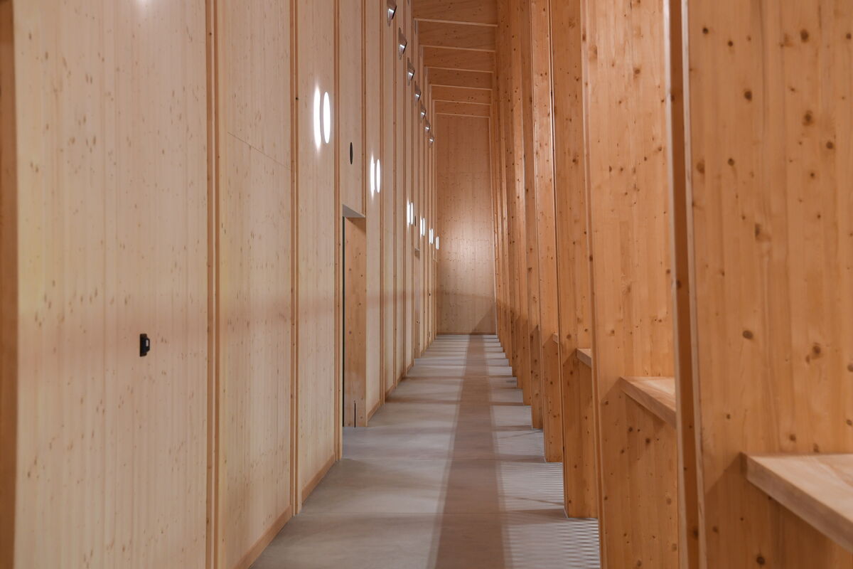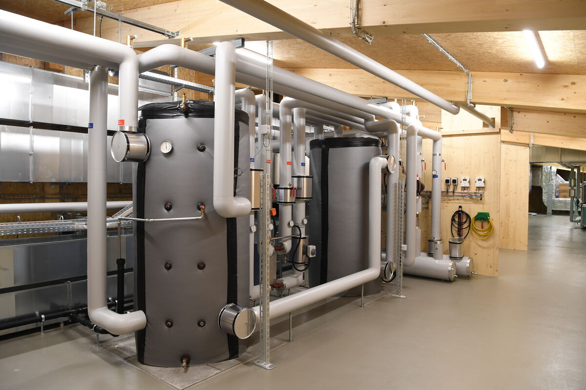 Im Obergeschoss befindet sich zudem die gesamte Technik – was sonst oft im Keller untergebracht ist: Lüftung, Heizungen, Elektroinstallationen. Denn unter der neuen Halle liegt ein Teil der alten, die nun als Rückhaltebecken dient. Mit Kies gefüllt, speichert es Regenwasser, das dosiert in die Kanalisation geleitet wird. Die neue Pelletheizung ersetzt die bisherige veraltete Ölheizung – sie versorgt auch Schule und Kindergarten.