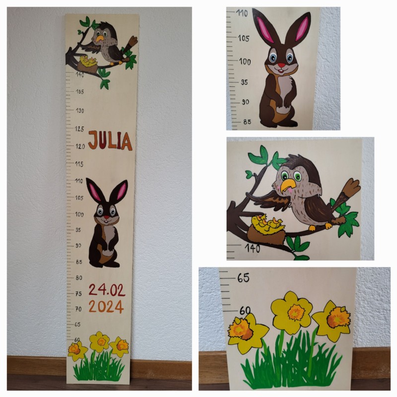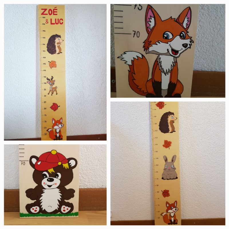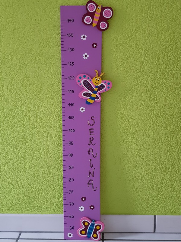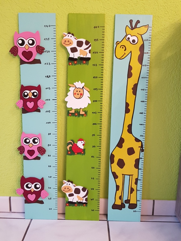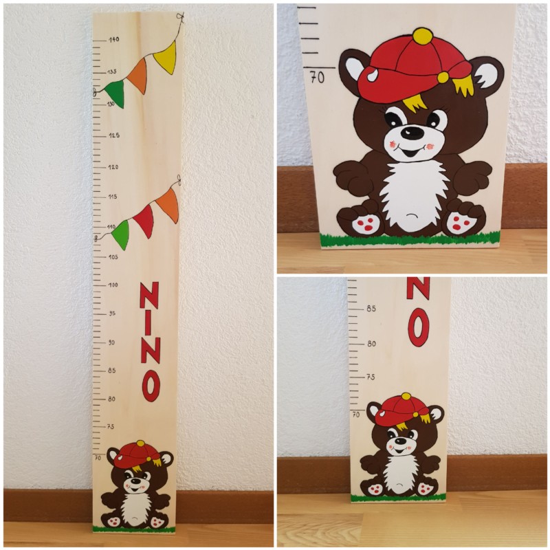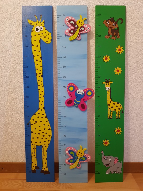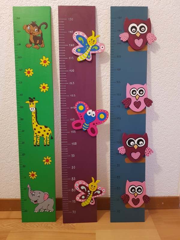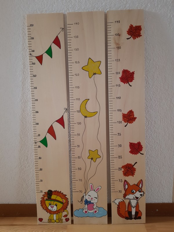 Wir gestallten und Personalisieren für sie Messlatten und Garderoben aus Holz nach ihrem Wunsch. Für Mädchen kann ein Haarspangen band angebracht werden.