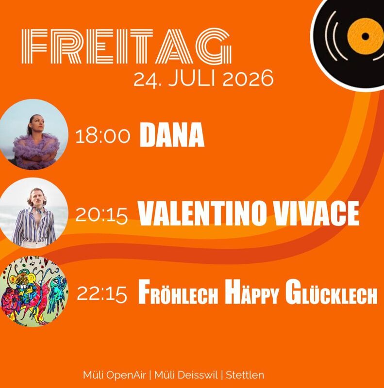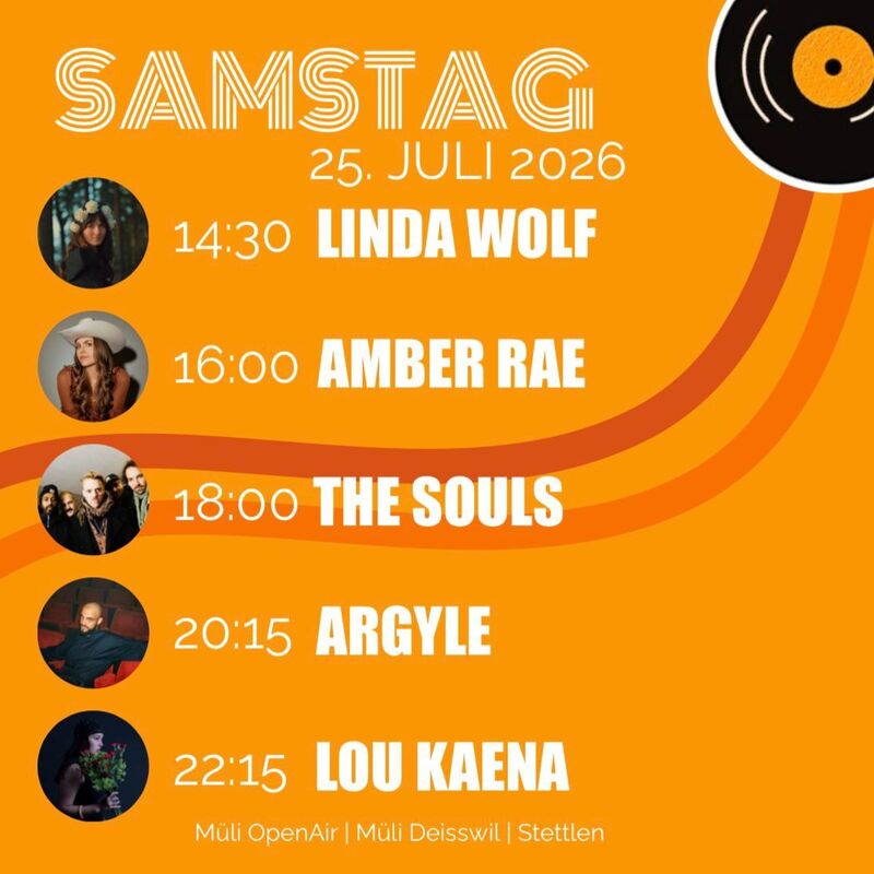 Bereits nach 2 Jahren statt der üblichen 4 Jahren möchten wir erneut ein Stück Sommerkultur ins Worblental bringen. Ein Wochenende voller Live-Musik, kulinarischen Köstlichkeiten und unvergesslichen Begegnungen. Zwei Abende, acht Acts, null Langeweile. Mit dabei beim Müli OpenAir sind dieses Jahr: Argyle, Valentino Vivace, DANA, The Souls, Amber Rae, Lou Kaena, Linda Wolf und unser Surprise Act Fröhlech Häppy Glücklech!