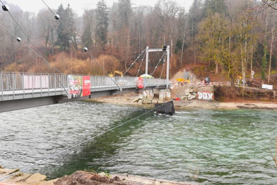 Die Baumaschinen ziehen aber noch nicht von dannen. Neben der neuen Schützenfahrbrücke, ein paar Meter aareaufwärts, haben die Arbeiten für eine neue Freispiegelleitung des Wasserverbunds Region Bern begonnen. Die Bauarbeiten dauern gemäss Wasserverbund voraussichtlich bis Ende Jahr.