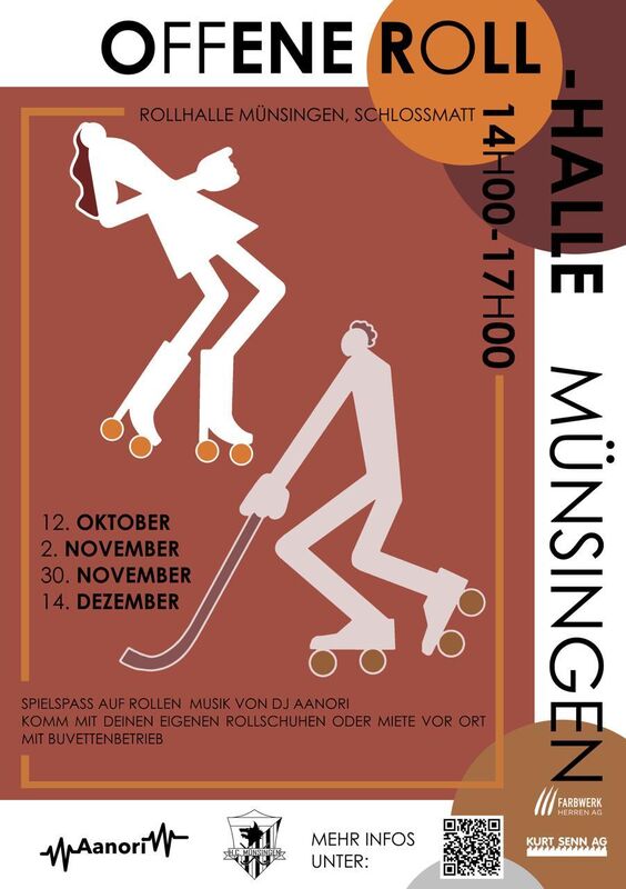 Die H.C. Münsingen Wölfe öffnen ihre Halle und laden zur Offenen Roll-Halle ein: Vier Sonntage im Herbst 2025 (12.10., 2.11., 30.11., 14.12., jeweils 14–17 Uhr) verwandelt sich die Schlosmatte in eine bunte Roller-Area. DJ AanoAanori sorgt für die Beats, die Buvettelkommen – mit eigenen Rollschuhen ist der Eintritt kostenlos. DJ Aanori sorgt für die Beats, die Buvette für Snacks und Getränke, und das HCMW-Team begleitet Gross und Klein sicher durchs Programm.