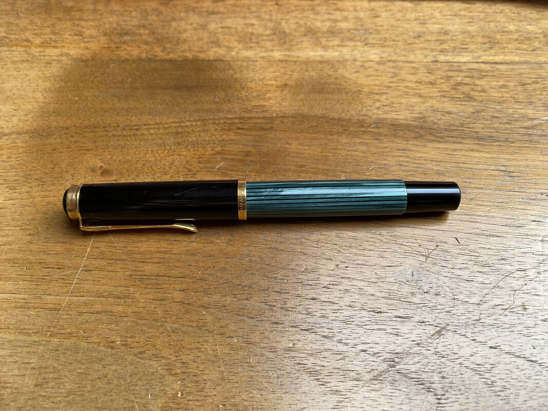 Klassischer Pelikan M400 (Old Style) aus der Produktionszeit 1982–1997. Grüngestreifter Schaft mit schwarzer Kappe und vergoldeten Beschlägen. Ausgestattet mit einer 14 Karat (585) Goldfeder, angenehmes Schreibgefühl.