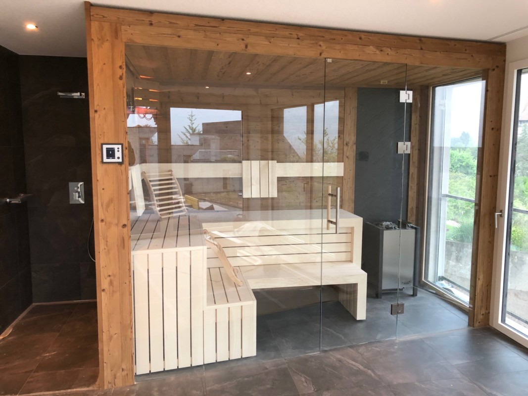 Qualitäts-Saunas einzigartig in Zedern.- Fichten.-oder Arvenholz massiv mit Glastüre.