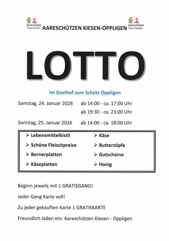 24.01.2026 bis 25.01.2026 Wir, die Aareschützen Kiesen Oppligen laden euch ein, an userem Lotto teilzunehmen.